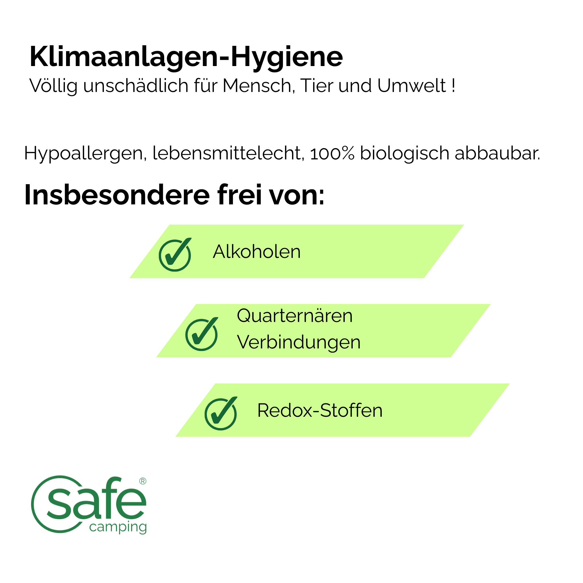 SAFE CAMPING Klimaanlagen-Hygiene ist speziell auf ihr Einsatzgebiet entwickelt: Viren, Bakterien und Pilze werden verlässlich gehemmt. Einzigartig ist die andauernde Keimreduzierung über ein langanhaltendes Coating des Klimaanlagen-Inneren mit einem Mikroschutzfilm aus natürlichen Biopolymeren. Die Anwendung ist komfortabel und wird empfohlen vor und nach der Überwinterung von Wohnwagen und Wohnmobilen sowie bei der Aufbereitung vor Vermietung.