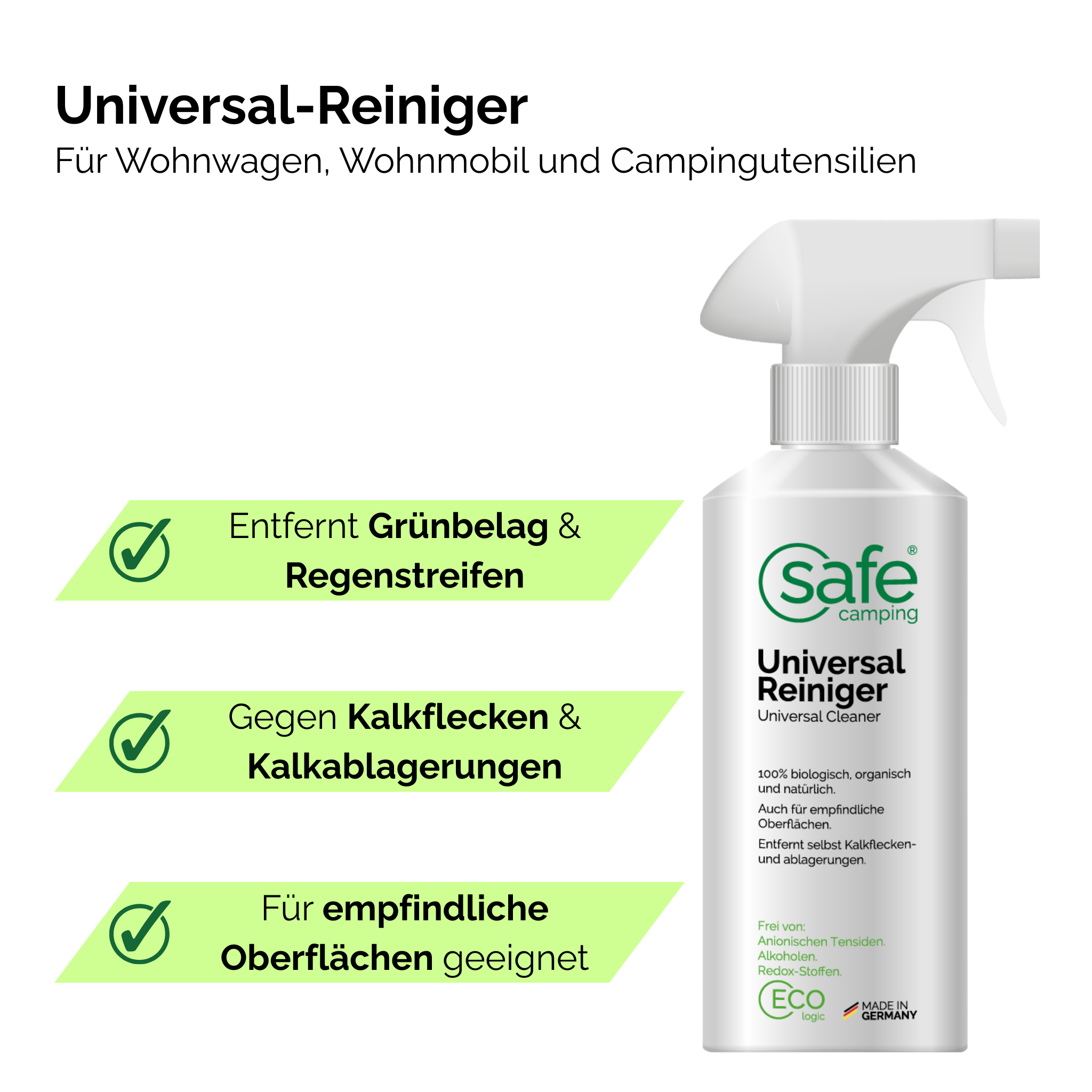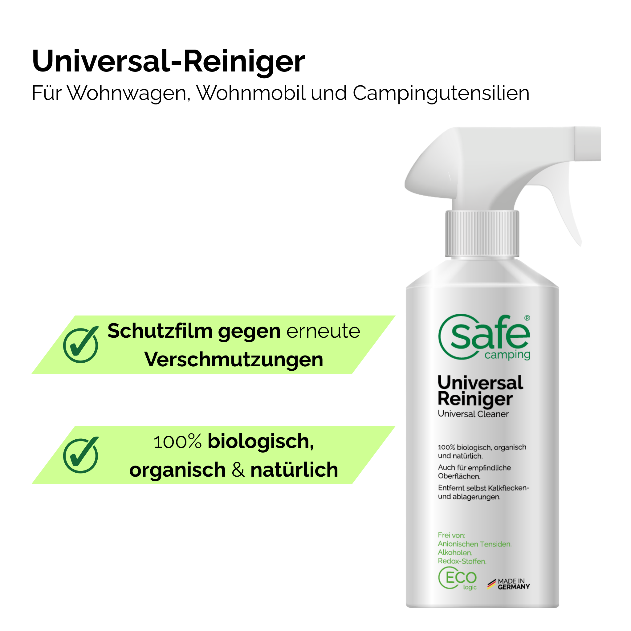 SAFE CAMPING Universal-Reiniger zur rückstandsfreien Reinigung von allgemeinen Verschmutzungen im Außen- sowie Innenbereich von Fahrzeugen, Vorzelten und aller Anbauten. Der sehr materialschonende Universal-Reiniger beseitigt zuverlässig Öl-, Fett- und Mineralverschmutzungen von Fahrzeugen wie Wohnwagen und Wohnmobilen, Vorzelten, Markisen und allen wasserbeständigen Oberflächen. Entfernt zuverlässig Kalkablagerungen und Kalkflecken an Armaturen und sonstigen Einbauteilen. Bildet einen Mikro-Schutzfilm und beugt erneuten Verschmutzungen vor. Auch für empfindliche Oberflächen.